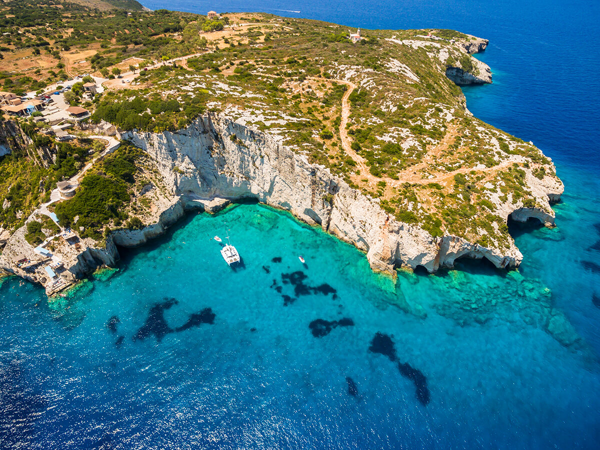 Zakynthos has the shape of an arrowhead, with the “tip” (Cape Skinari) pointing northwest. The western half of the island is a mountainous plateau and the southwest coast consists mostly of steep cliffs. The eastern half is a densely populated fertile plain with long sandy beaches, interrupted with several isolated hills, notably Bochali which overlooks the city and the peninsula of Vasilikos in the northeast. The peninsulas of Vassilikos to the north and Marathia to the south enclose the wide and shallow bay of Laganas on the southeast part of the island.